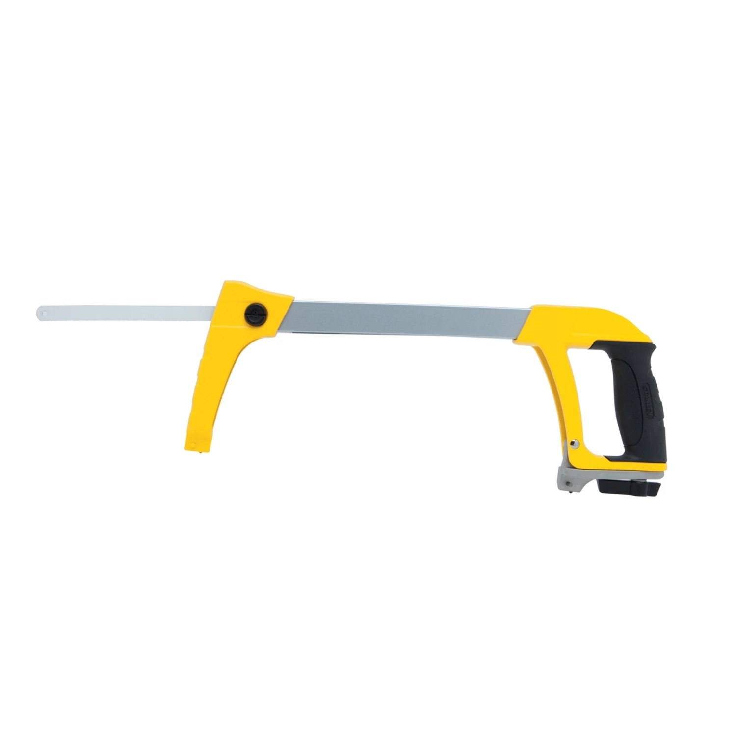 The Stanley STHT20140 is a 12- inch fixed blade hacksaw with a robust tubular metal frame. This saw allows for a 4.75 inch cutting depth, with up to 300 pound of blade tension. The 45 degree and 90 degree adjustable blade angles allow flush cuts.