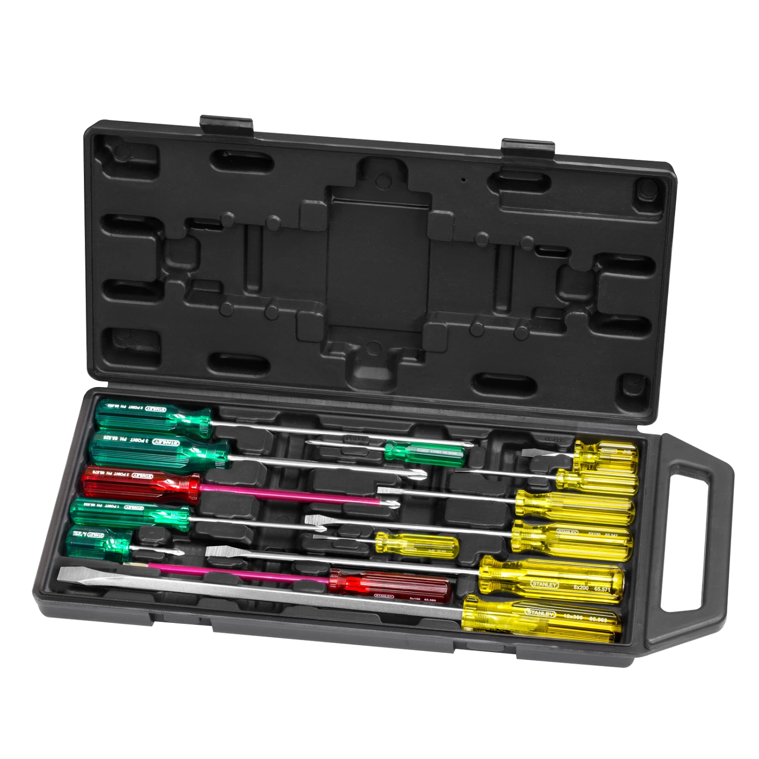 Every STANLEY tool is created to help you work better, smarter, faster. The Stanley 14 Piece Industrial Acetate Handle Screwdriver set has cellulose acetate handles allow for impact resistance, it has premium grade nickel chrome vanadium steel for maximum toughness and resistance to twisting.