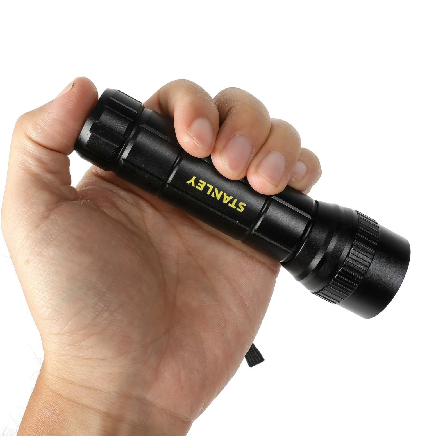The Stanley flashlight is made from 6063 aircraft grade aluminium. The strong housing boasts a bold check pattern design, offering anti-slip and anti-roll use. A strong 380 lumens of light in high made provides a beam distance of 220 meters, providing ample light for just about any need. Run time is 3 hours in high mode and 6 hours in low mode. Comes with 4 x AAA alkaline batteries ready for use.